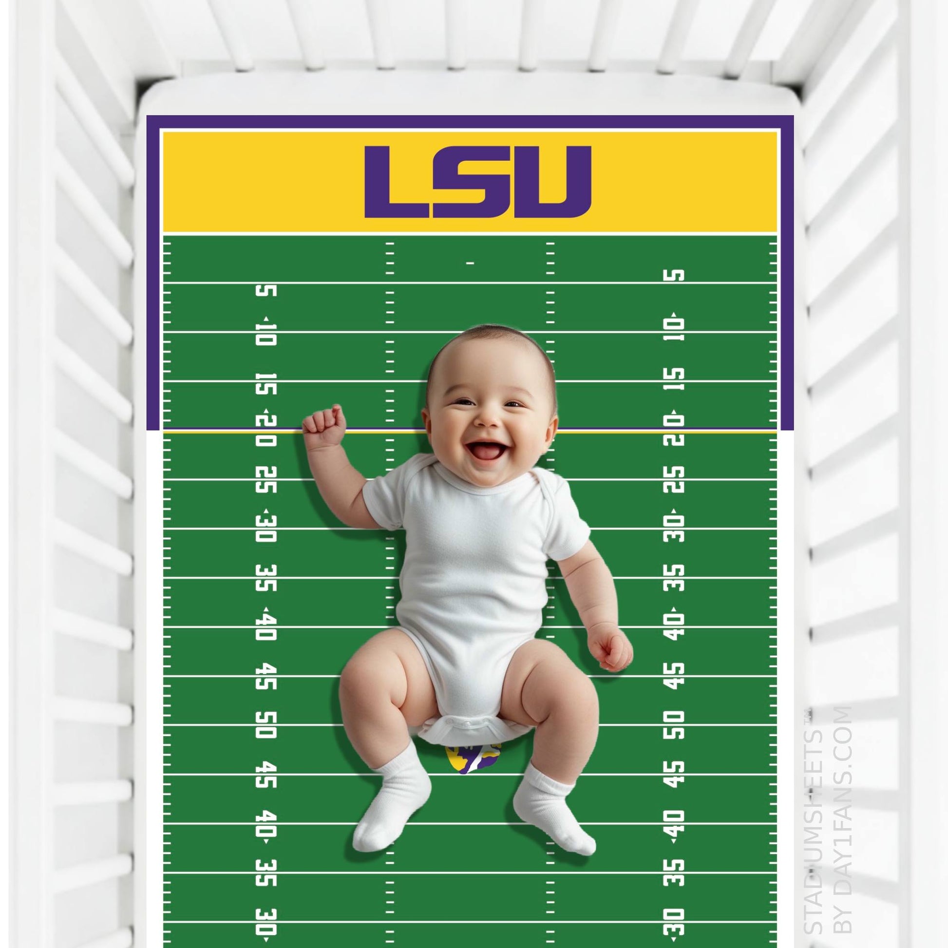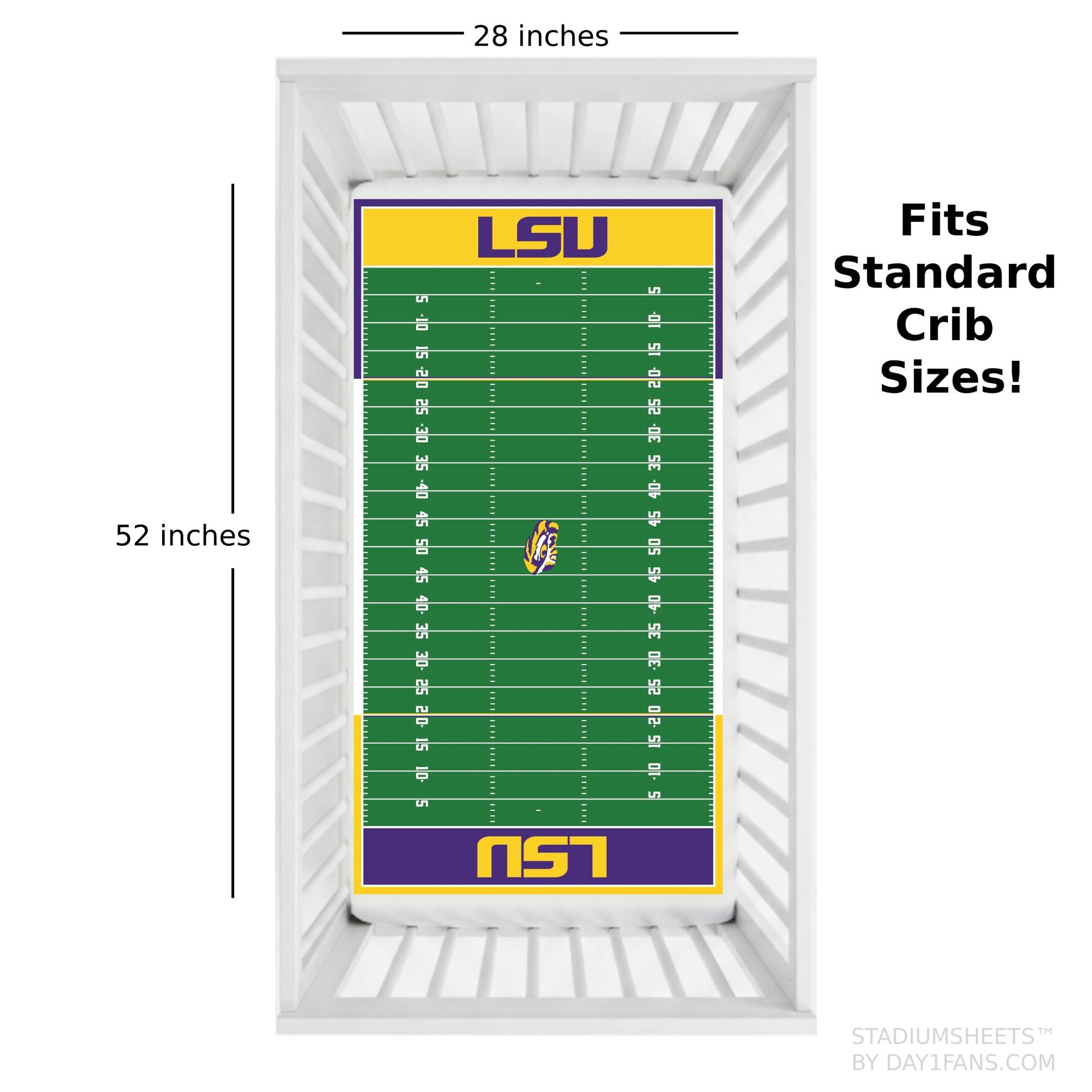 Our LSU Tigers StadiumSheets fit standard cribs.