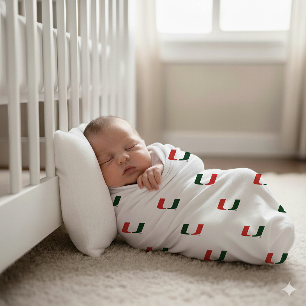 Give your bundle of joy comfort and school spirit with this officially licensed University of Miami muslin swaddle! Made from ultra-soft, breathable 100% cotton muslin, this swaddle is perfect for keeping your baby cozy while showcasing your Hurricanes pride. Lightweight and versatile, it’s ideal for swaddling, nursing, stroller covers, and more. Featuring iconic University of Miami colors and logos, this high-quality blanket is a must-have for any future 'Canes fan.