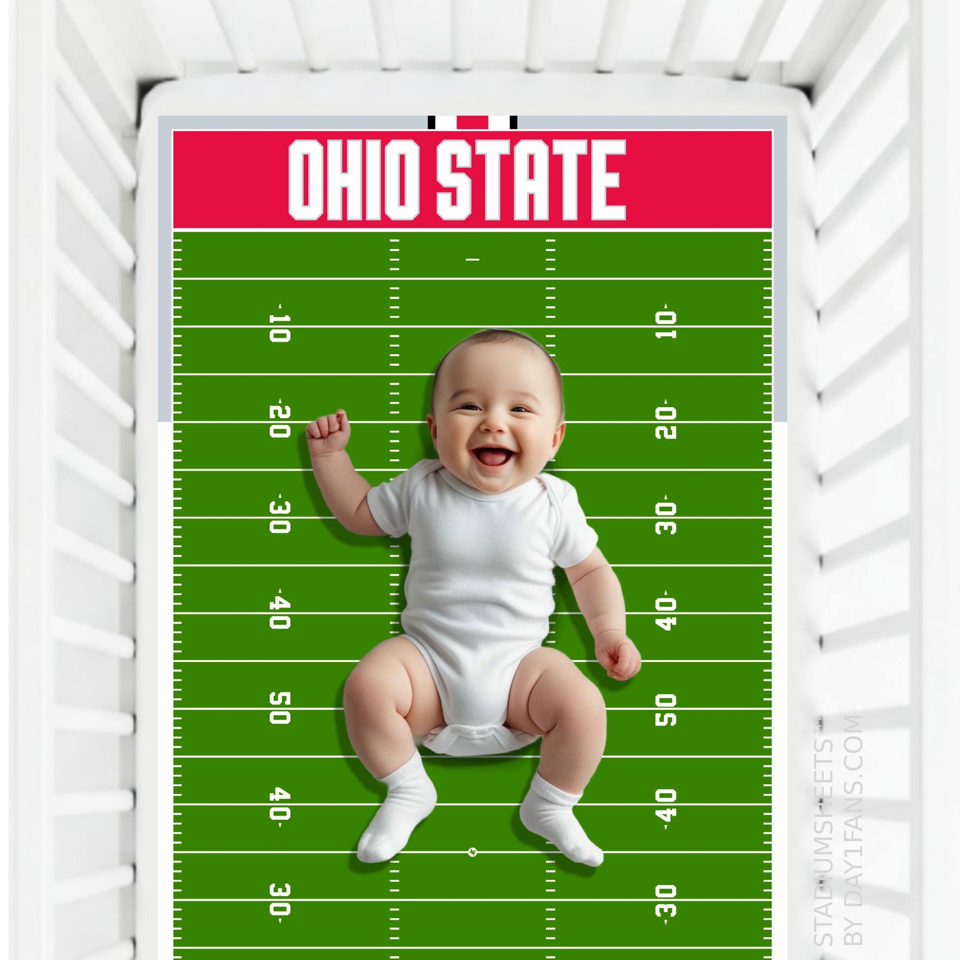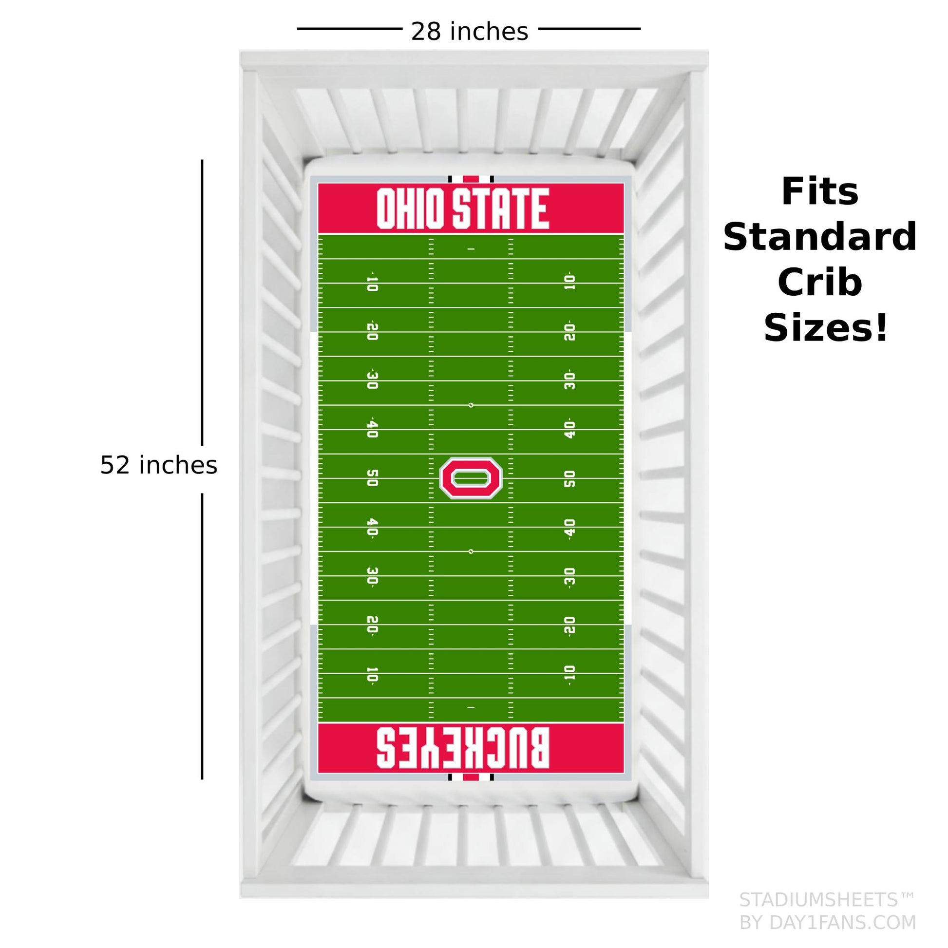 Our Ohio State Buckeyes StadiumSheets fit standard cribs.