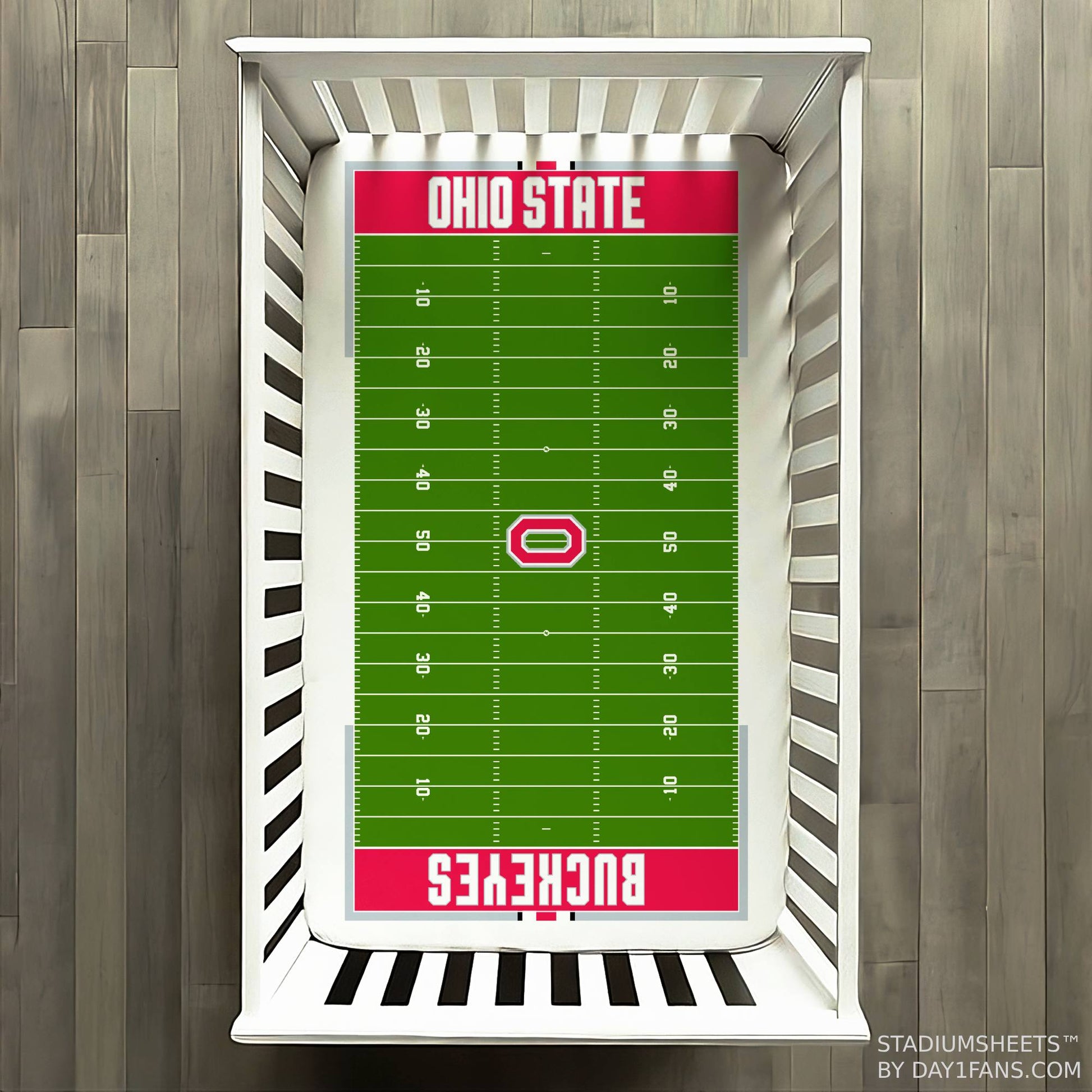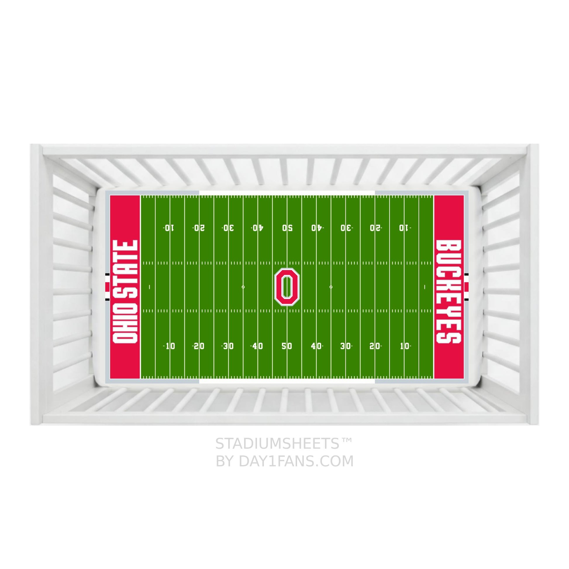 A crib sheet designed to look just like the Safelite Field at the Ohio Stadium in Columbus, OH. The Ohio State Buckeyes StadiumSheets™ Crib Sheets has the official Buckeyes branding along with all the elements of the football field like yard lines, hash marks, and end zones.
