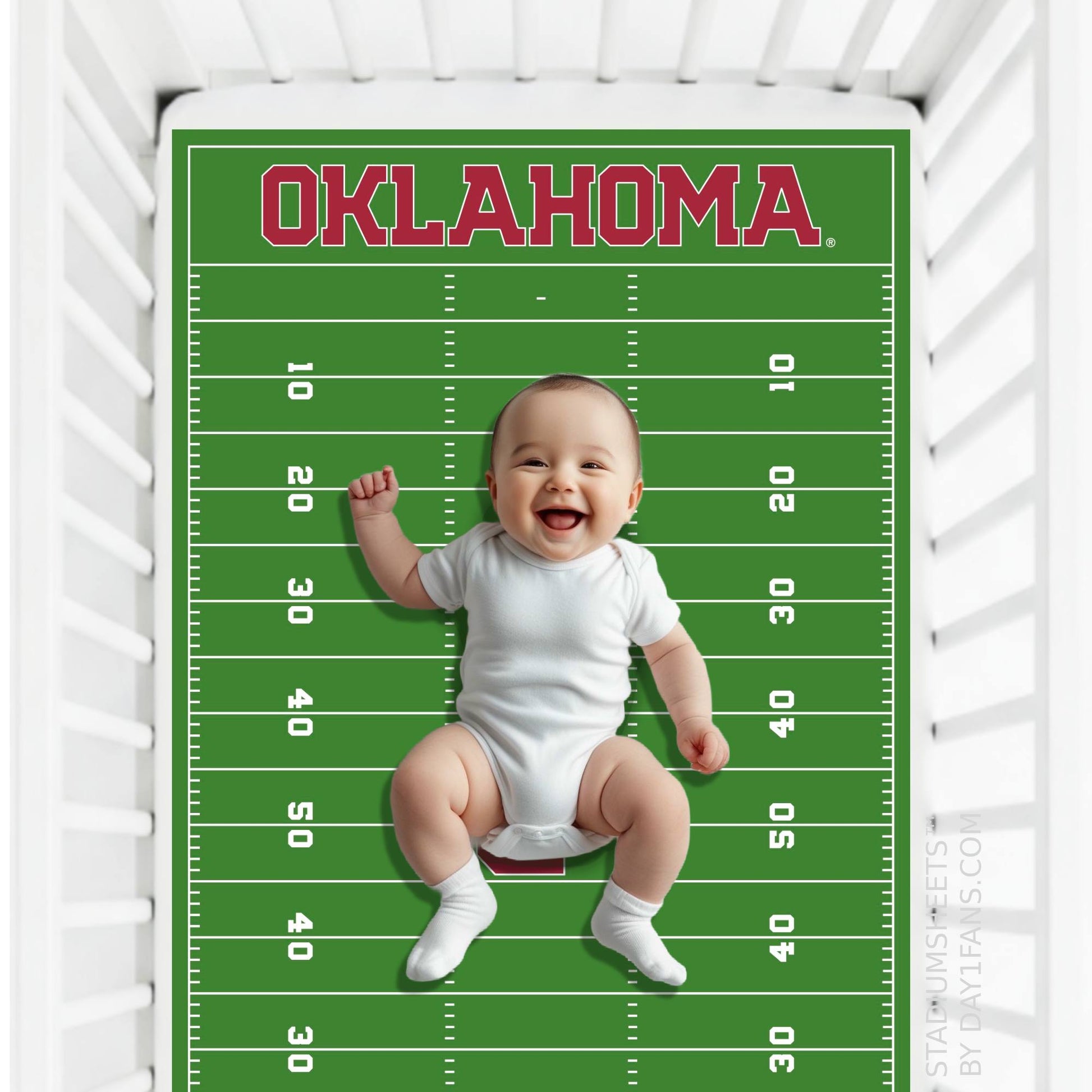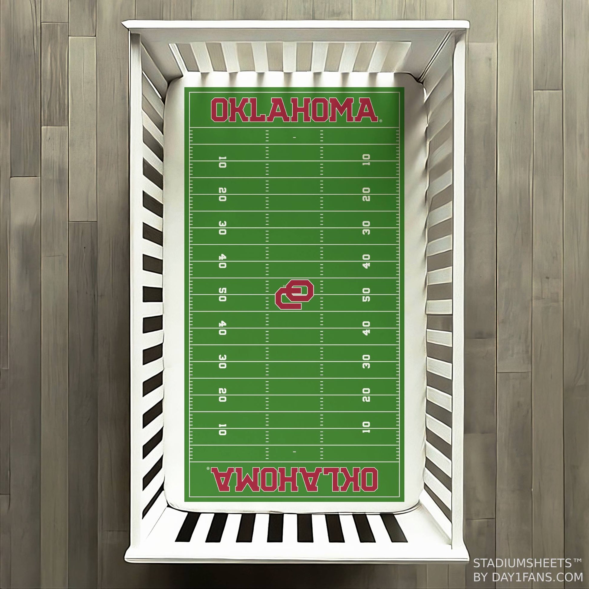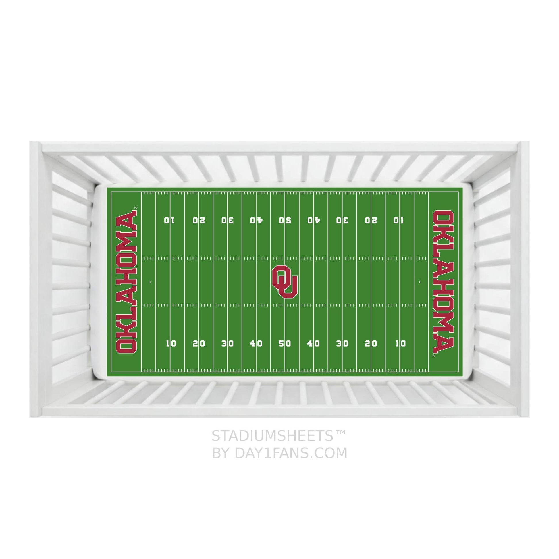 A crib sheet designed to look just like the Owen Field at the Gaylord Family Oklahoma Memorial Stadium in Norman, OK. The Oklahoma Sooners StadiumSheets™ Crib Sheets has the official Sooners branding along with all the elements of the football field like yard lines, hash marks, and end zones.