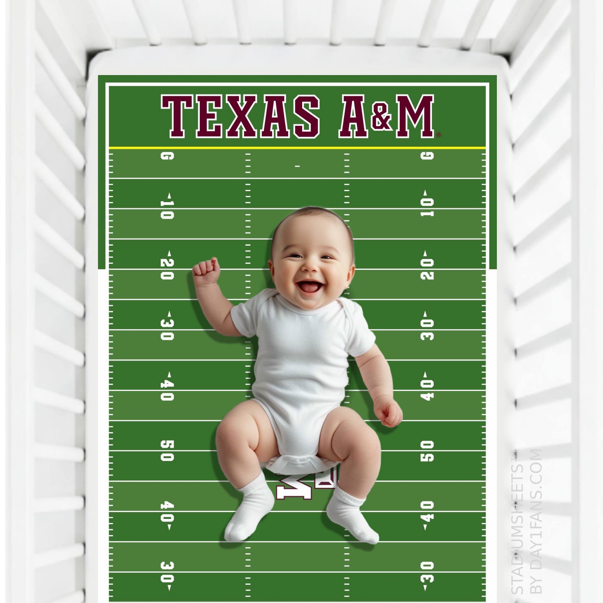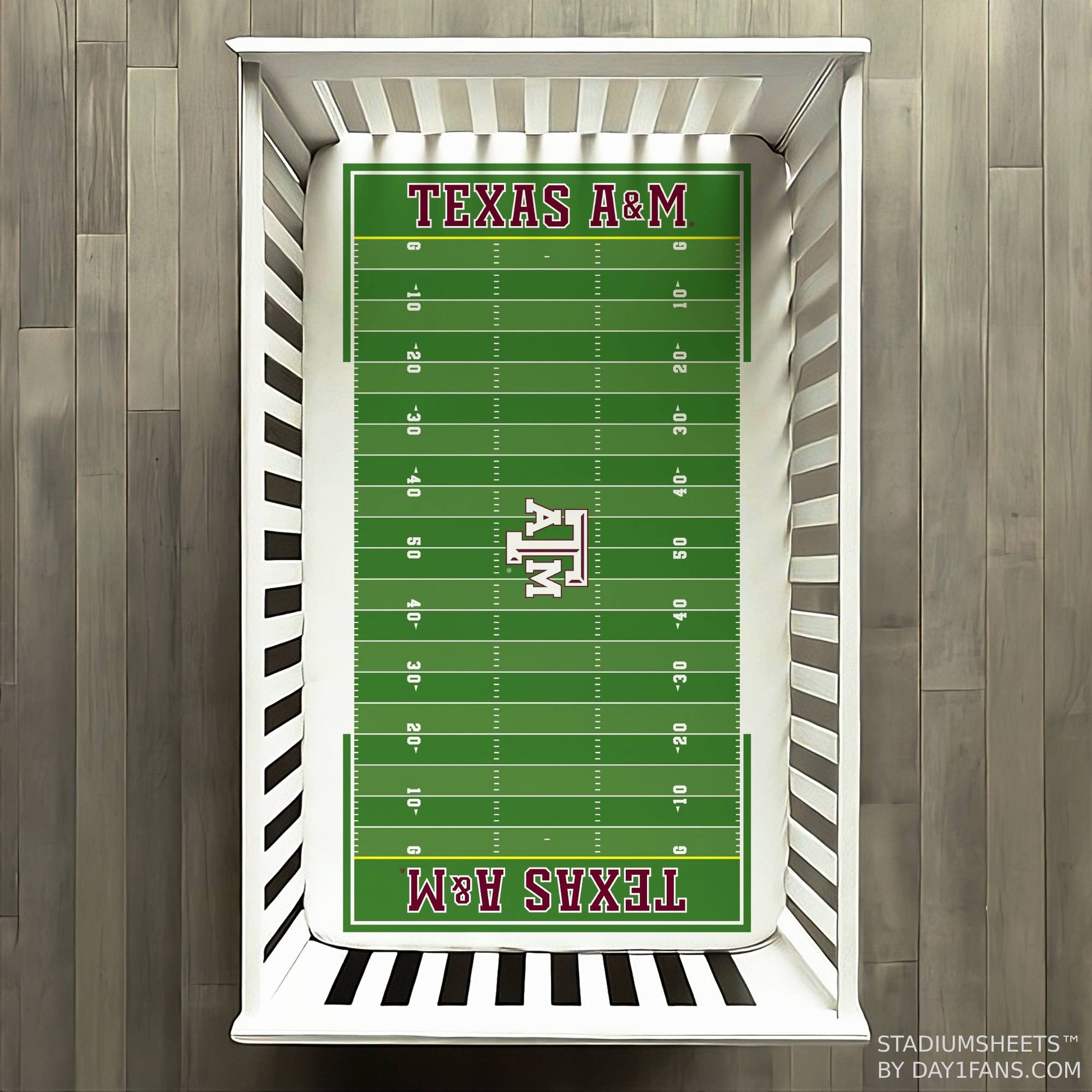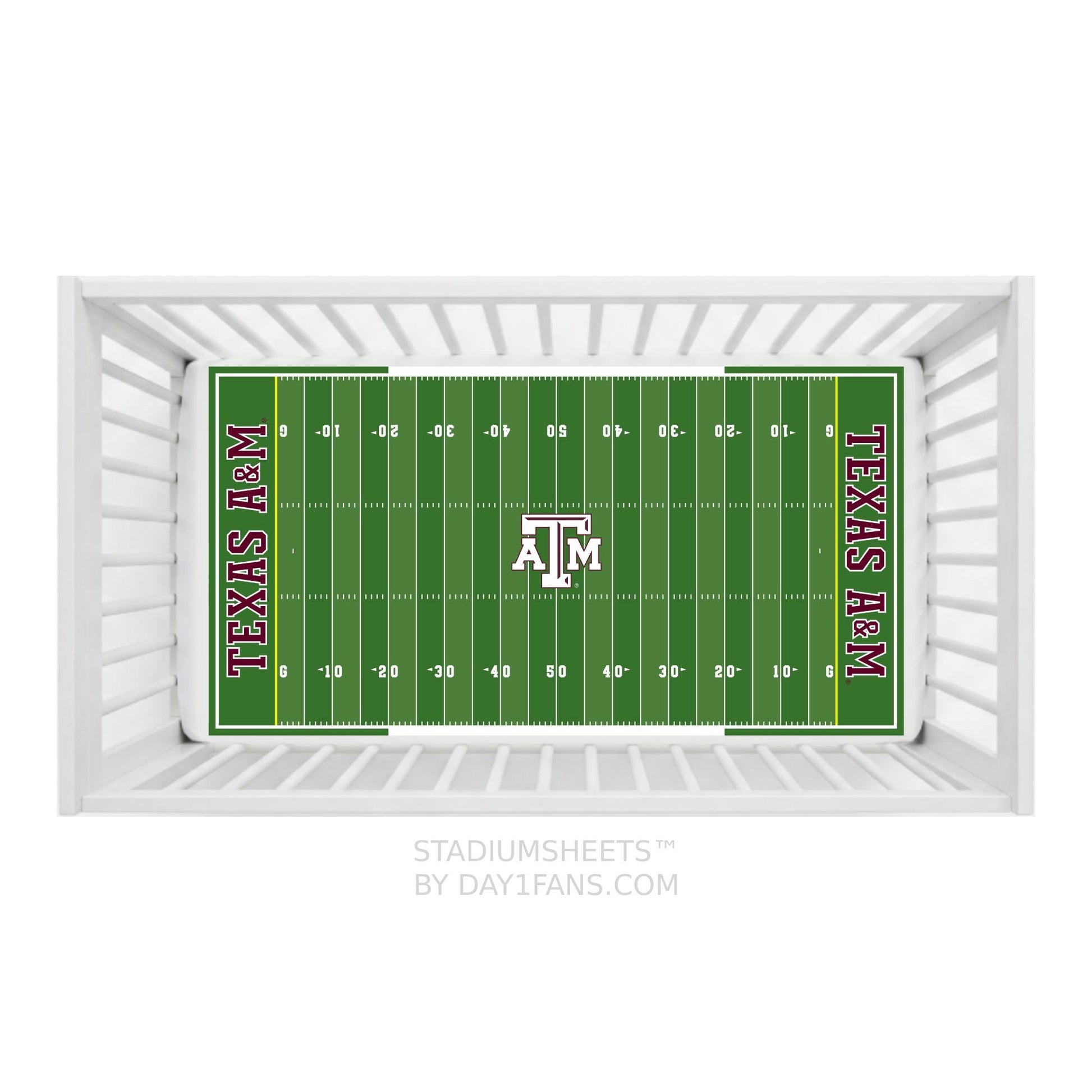A crib sheet designed to look just like the field at the Kyle Field in College Station, TX. The Texas A&M Aggies StadiumSheets™ Crib Sheets has the official Aggies branding along with all the elements of the football field like yard lines, hash marks, and end zones.